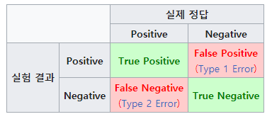 추론과 실제 결과(오분류표)