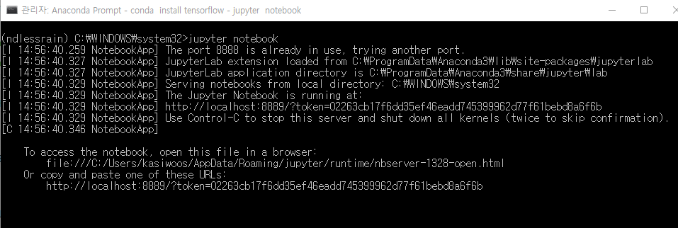 근데 네비게이터에서 먼저 뜬 노트북이 8888포트이고, 프롬프트에서 실행한 노트북은 포트가 8889임.