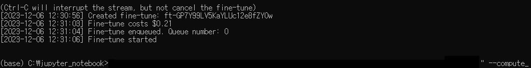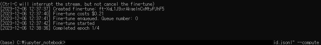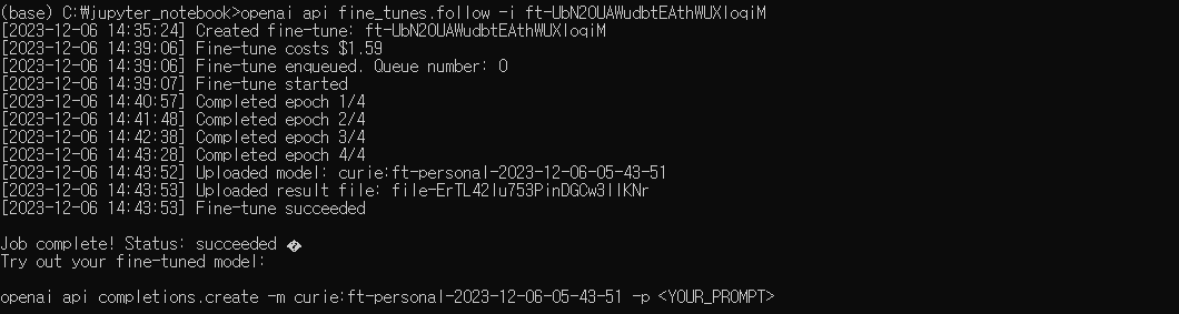 최종적으로 아래와 같이 모델 ID까지 얻은 부분을 확인할 수 있다. (curie:ft-personal-2023-12-06-05-43-51)