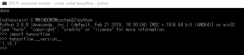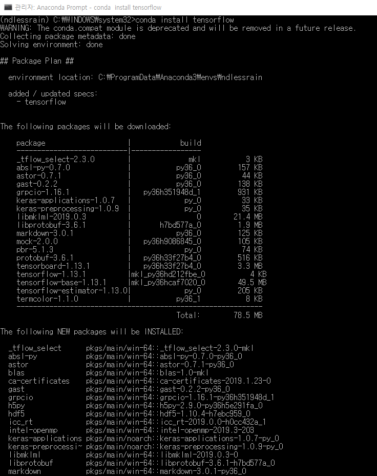 conda install tensorflw 커맨드로 tensorflow를 설치.