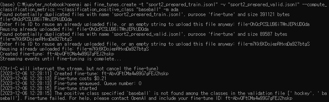 openai api fine_tunes.create -t "sport2_prepared_train.jsonl" -v "sport2_prepared_valid.jsonl" --compute_classification_metrics --classification_positive_class "baseball" -m ada
