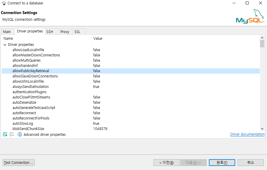 새 데이터베이스 연결 > db 종류 선택하고 > db 정보 입력하고 > Driver properties 탭 > allowPublicKeyRetrieval을 true로 변경. (false로 되어 있어서 안된거임)