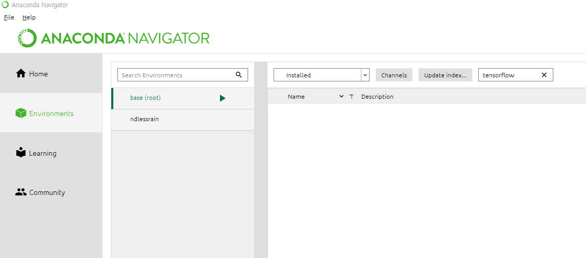 base 환경에서 tensorflow가 설치되어 있지 않았고 새로 만든 환경에 tensorflow가 설치되어 있었음.