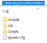 hello 폴더 안에는 env 라는 폴더가 생성이 되고 안에 가상환경 파일들이 들어 가게 됩니다.