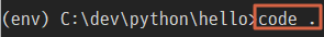 지금은 가상환경이 필요 하기 때문에 입력 하지 말고 가상환경이 적용이 된 상태에서 다음 code 명령으로 vscode 를 띄웁니다.