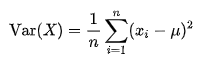 - 분산 : 평균으로부터 흩어진 정도. 모분산(Var = σ^2), 표본분산(S^2)